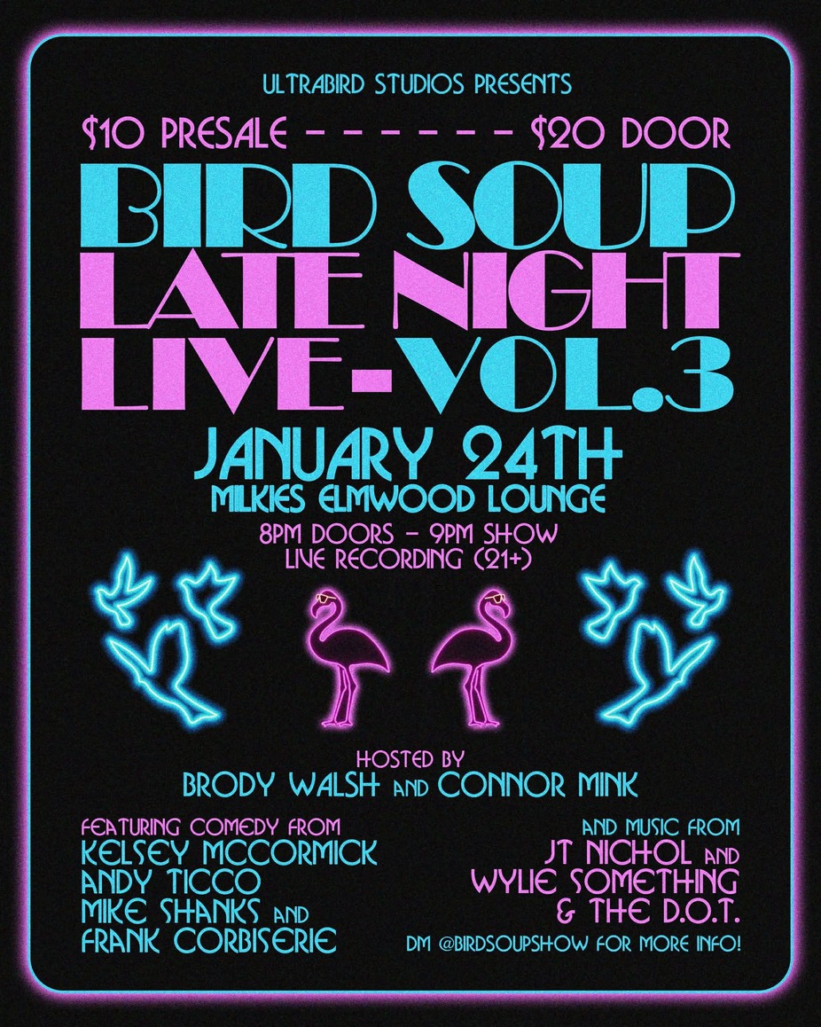 Bird Soup is back for the third iteration of Late Night Live at Milkie's Elmwood Lounge! Come see some of Buffalo's Funniest comics tell jokes and riff out an interview, with a backing band and a musical headliner.
