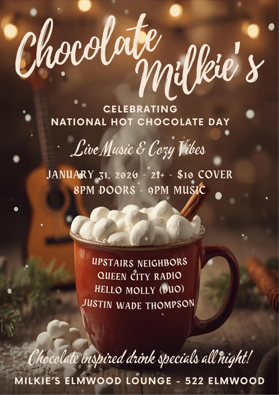 Celebrating National Hot Chocolate Day at Milkie's with Upstairs Neighbors, Queen City Radio, Hello Molly (Duo) and Justin Wade Thompson. Chocolate themed drink specials all night.